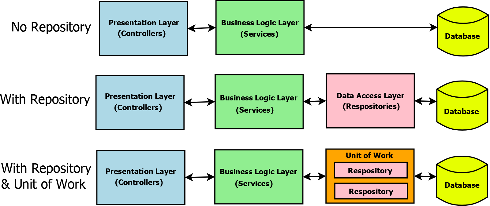 • روش جایگزین: برخی از توسعه‌دهندگان از رویکردهای دیگری مانند CQRS (Command Query Responsibility Segregation) استفاده می‌کنند که در آن منطق خواندن (Queries) و منطق نوشتن (Commands) کاملاً از هم جدا می‌شوند، و این امر نیاز به Repository سنتی را کاهش می‌دهد.