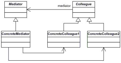 الگوی میانجی در نرمافزار نیز دقیقاً همین نقش را بر عهده دارد. به جای اینکه مجموعهای از اشیاء (که به آنها Colleagues یا همکاران گفته میشود) مستقیماً به یکدیگر ارجاع داشته باشند و متدهای یکدیگر را فراخوانی کنند، همگی یک شیء میانجی را میشناسند. هر همکار، رویدادها و تغییرات وضعیت خود را به میانجی اطلاع میدهد و میانجی تصمیم میگیرد که کدام یک از همکاران دیگر باید از این رویداد مطلع شوند و چه واکنشی نشان دهند.